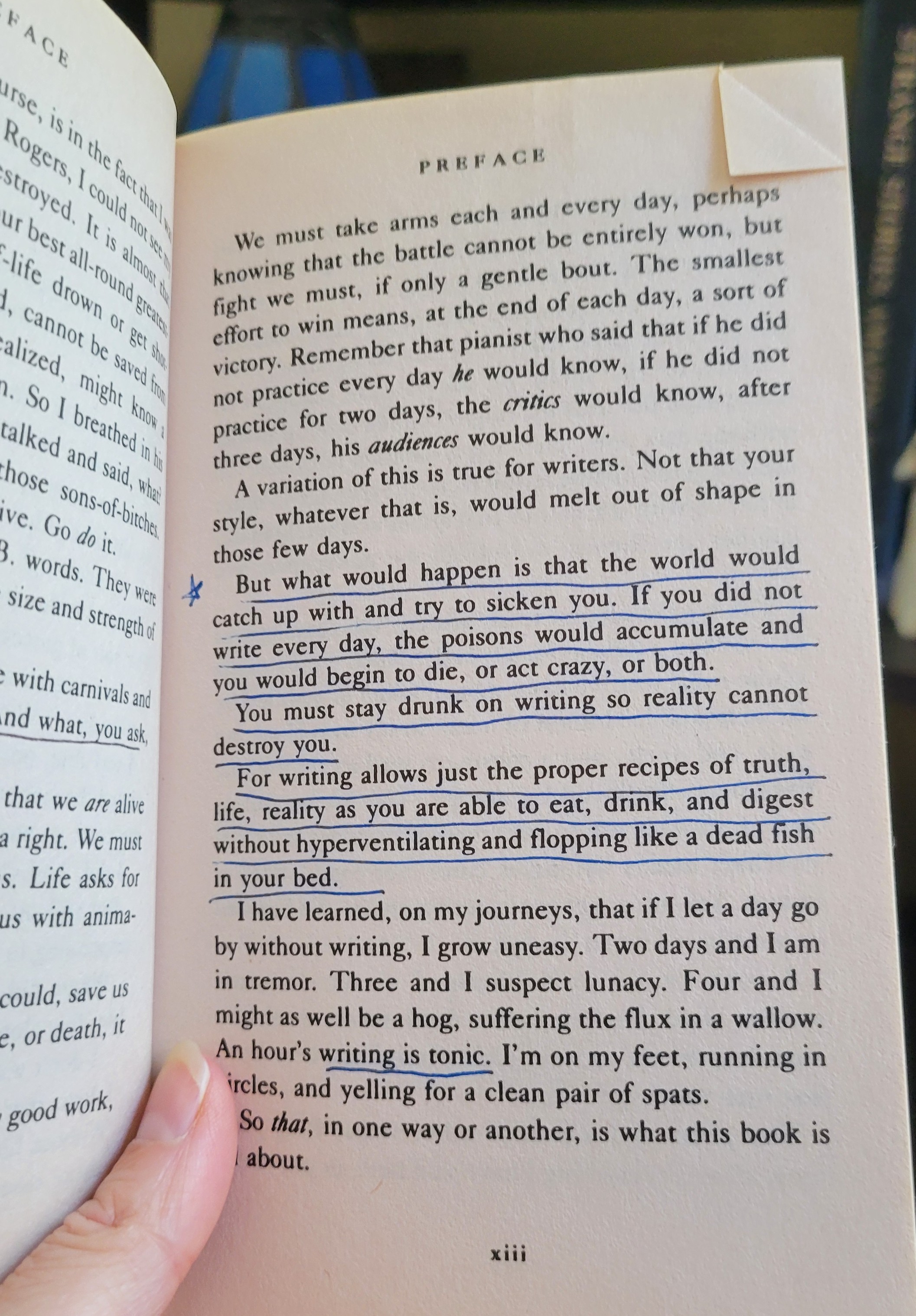 From the Preface on, I felt as if I was sitting down to have a conversation with Mr. Bradbury about the meaning of life. As if someone finally understood why in the hell I spent so much time with a pen in my hand, writing ridiculous adventure stories, journaling ideas, and imagining how I could tell a story. No, it’s not just a hobby or even a career. As he put it: “Writing is tonic.”