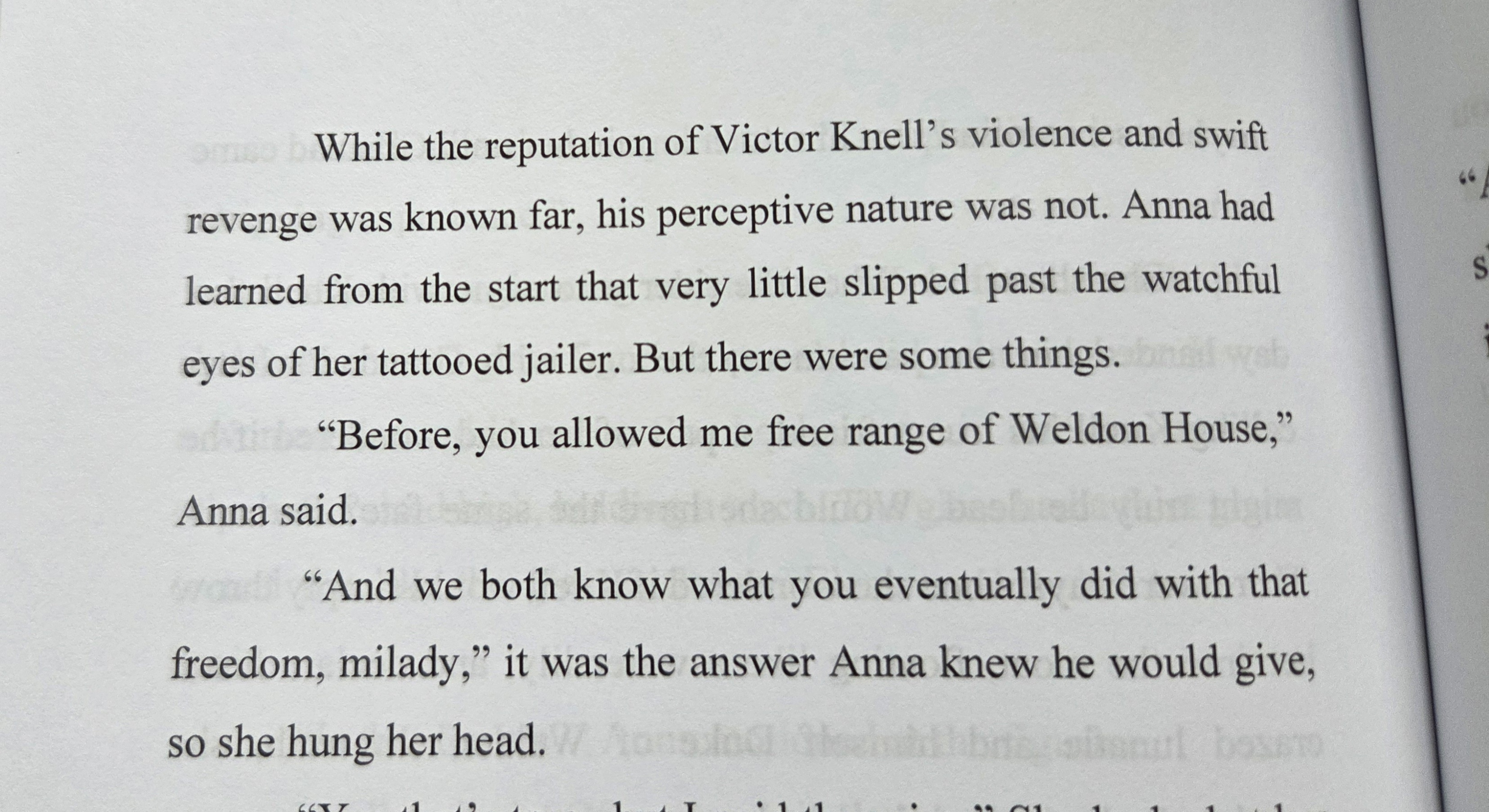 “Knell was staring at her, posed with an expression Anna could not exactly figure out. Was that confusion, or…”